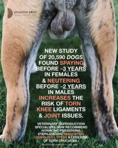 “For example, if the femur has achieved its genetically determined normal length at 8 months when a dog gets spayed or neutered, but the tibia, which normally stops growing at 12 to 14 months of age, continues to grow, then an abnormal angle may develop at the stifle. In addition, with the extra growth, the lower leg below the stifle likely becomes heavier (because it is longer), and may cause increased stresses on the cranial cruciate ligament.”