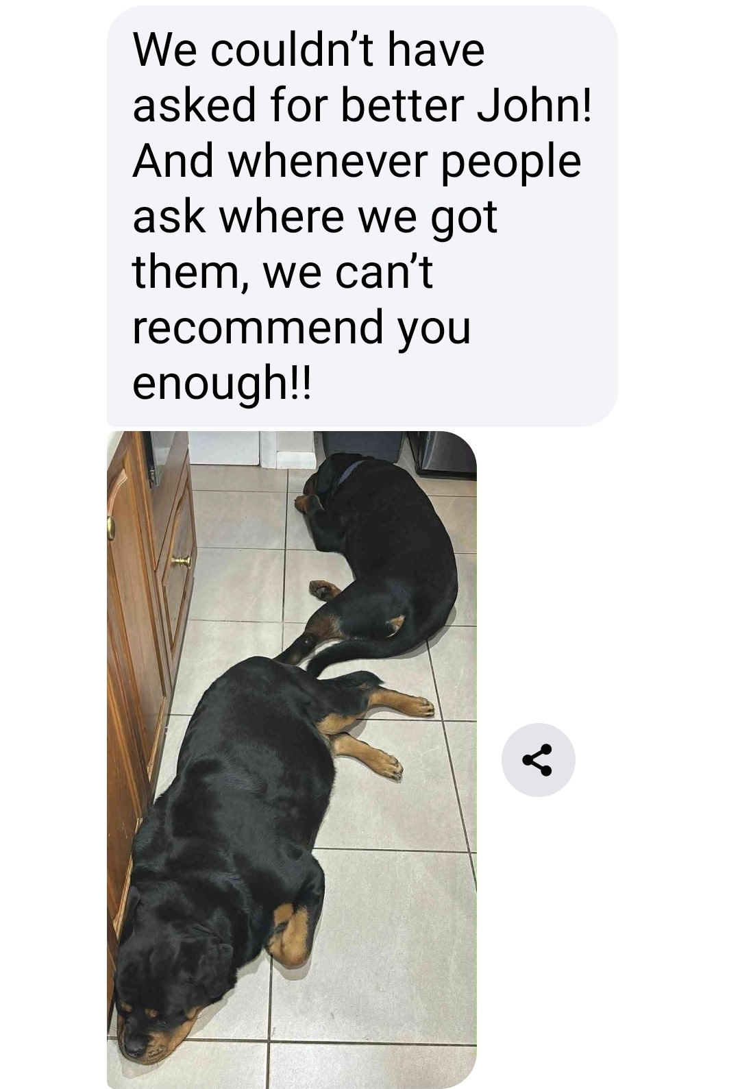 We just bought our 6th pup from John at Meisterhunde Rottweilers. They have the most amazing and beautiful puppies and that grow into incredible companions and guardians. We recommend anyone looking to add a Rottweiler to the family to contact John.